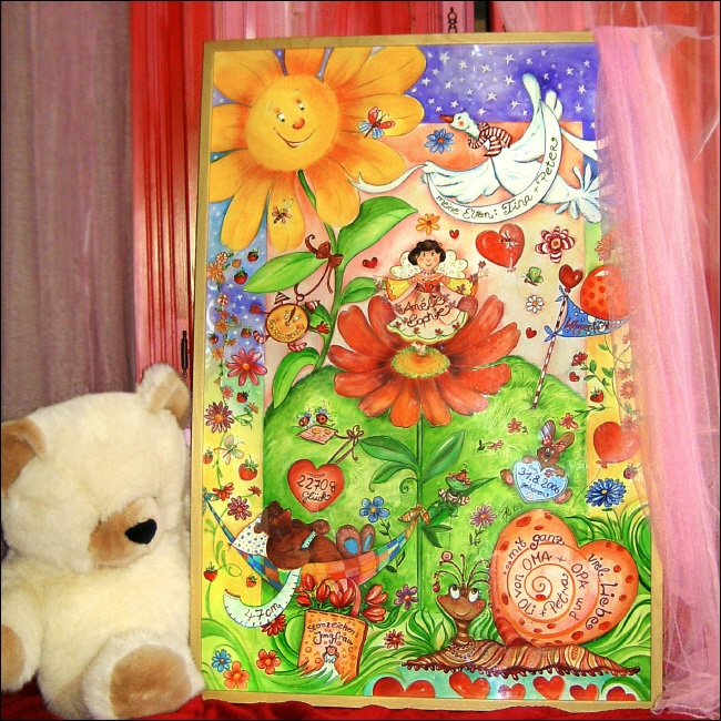 Sie schenken einen "Freund", der erst beim Einschlafen und Träumen über dem Bettchen hilft und später als fröhlicher Blickfang das Kinderzimmer erhellt. Sie schenken ein Bild, welches „Sie“ oder „Ihn“ ein Leben lang daran erinnern wird, mit wieviel Freude man auf der Welt willkommen geheißen wurde. Das ist kein Geschenk von dem man sich trennt, vielmehr wird es als ein Stück Familiengeschichte weitervererbt.
